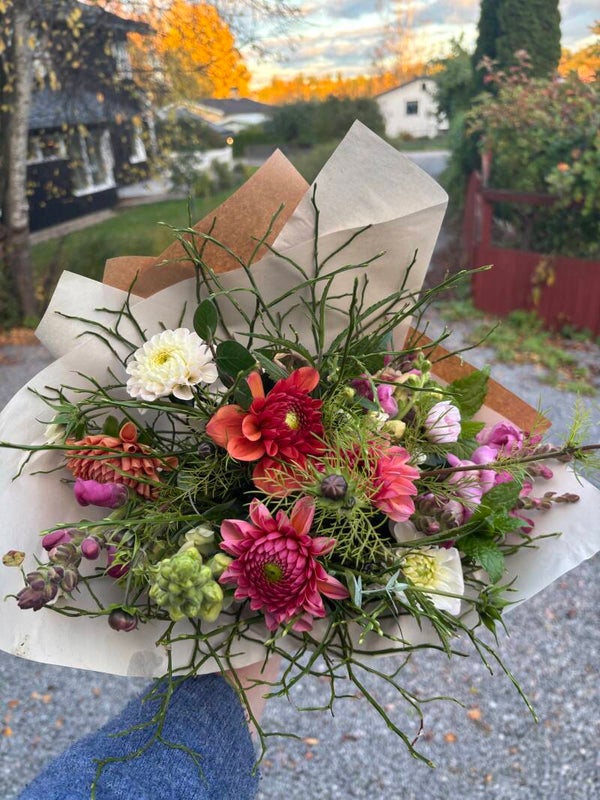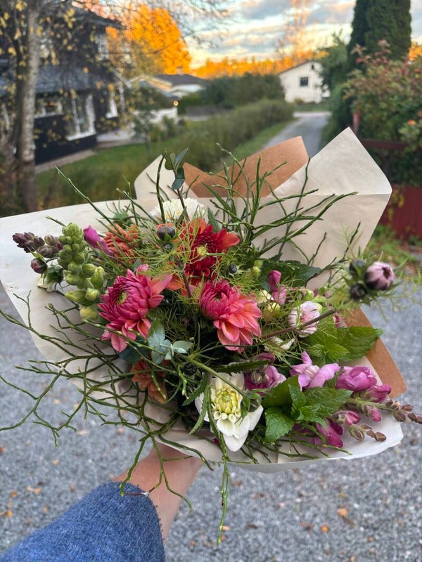 Bukett B: lejongap, dahlia, blåbärsris, rosenskära, m.m.